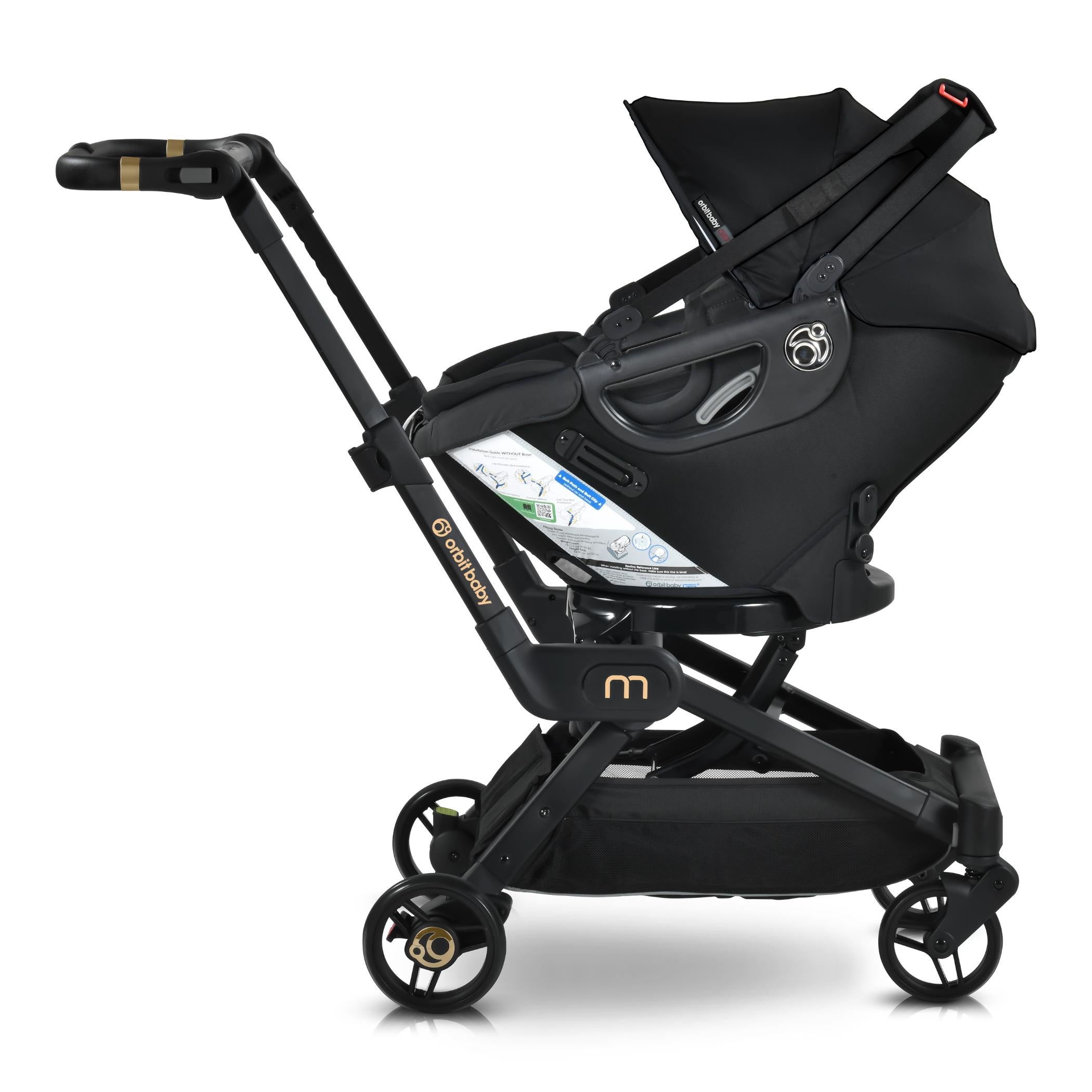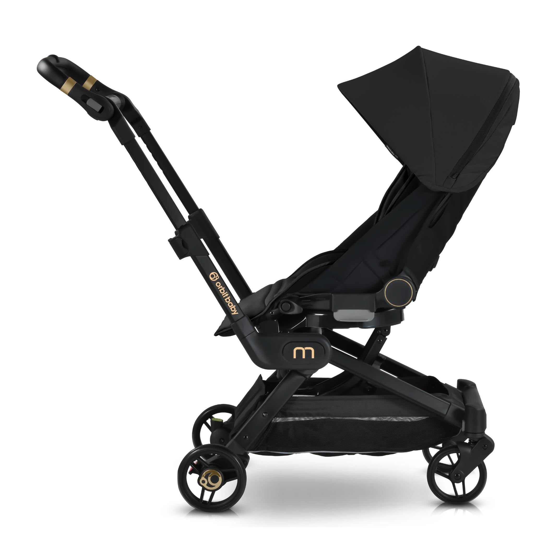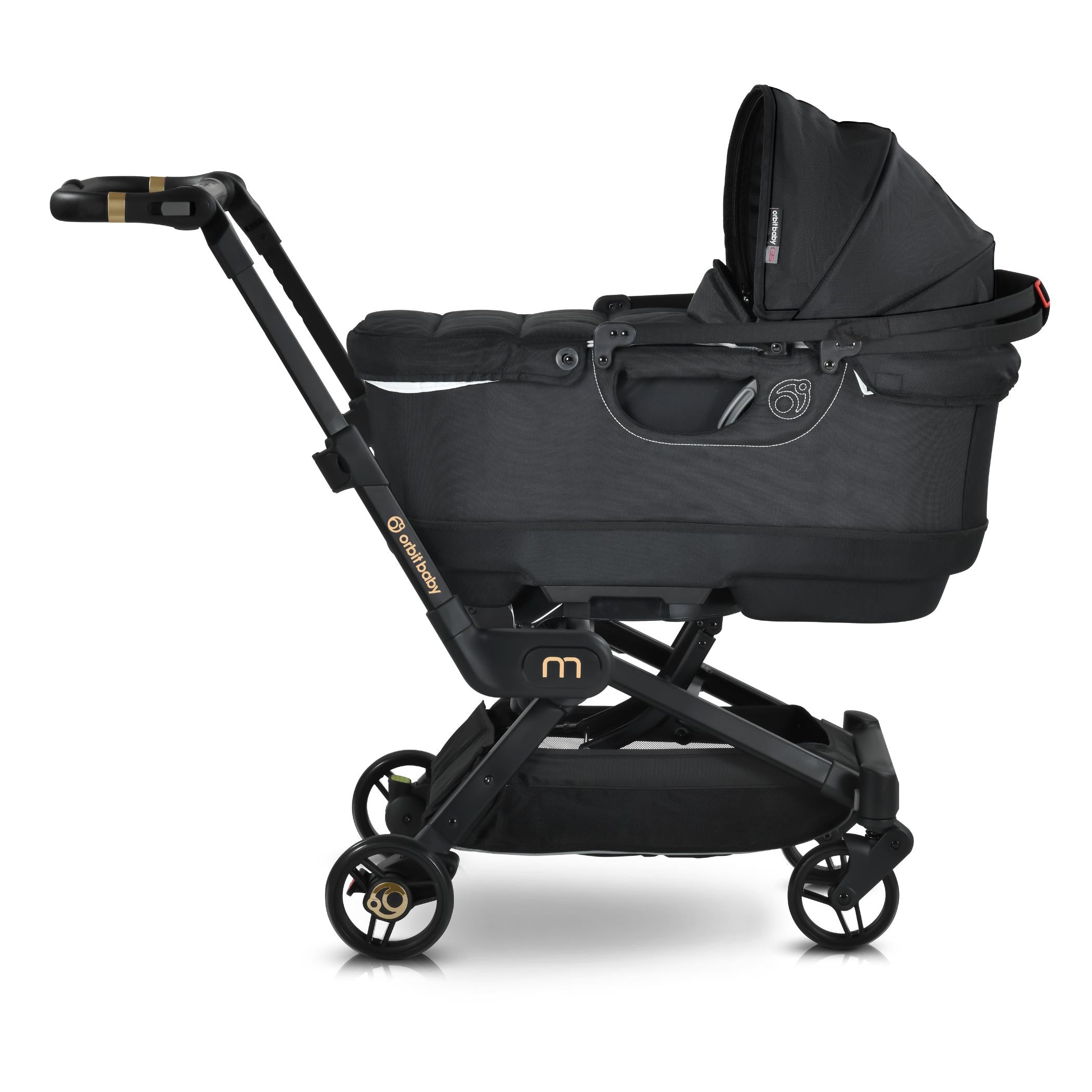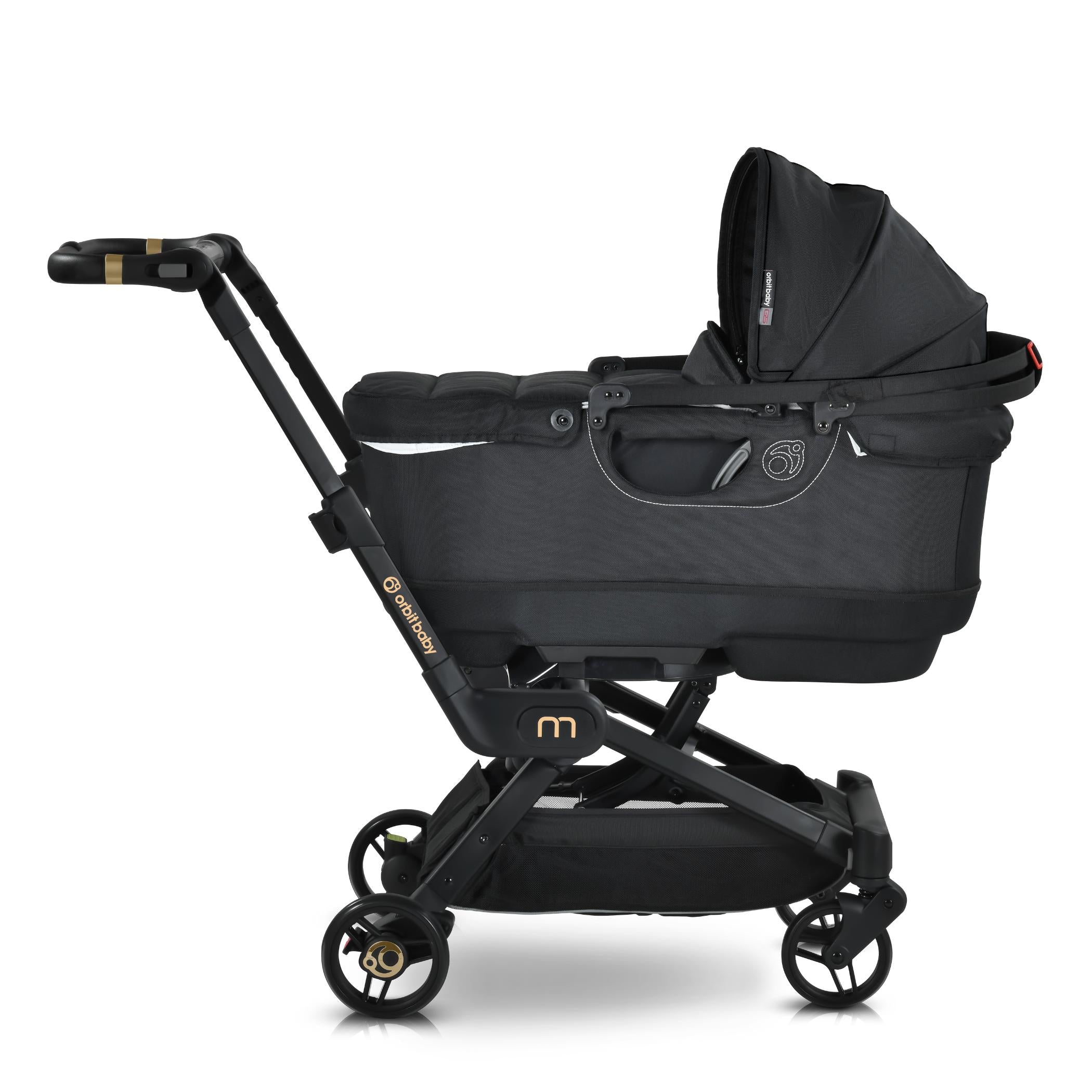 The M+ Stroller is compatible with the Orbit Baby Infant Car Seat, Bassinet and G5 Stroller Seat.