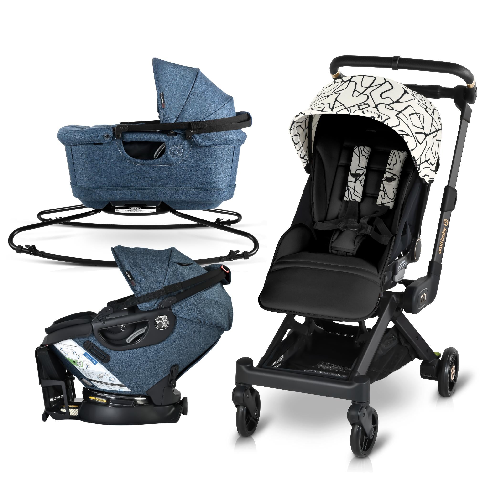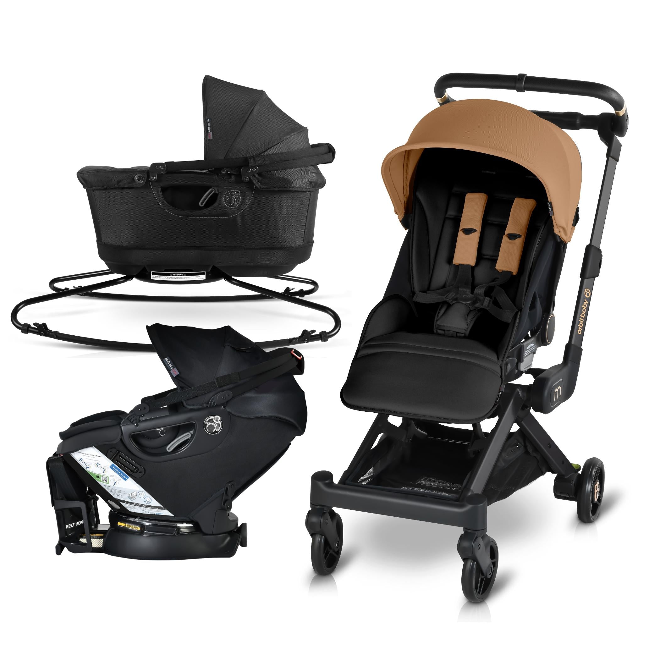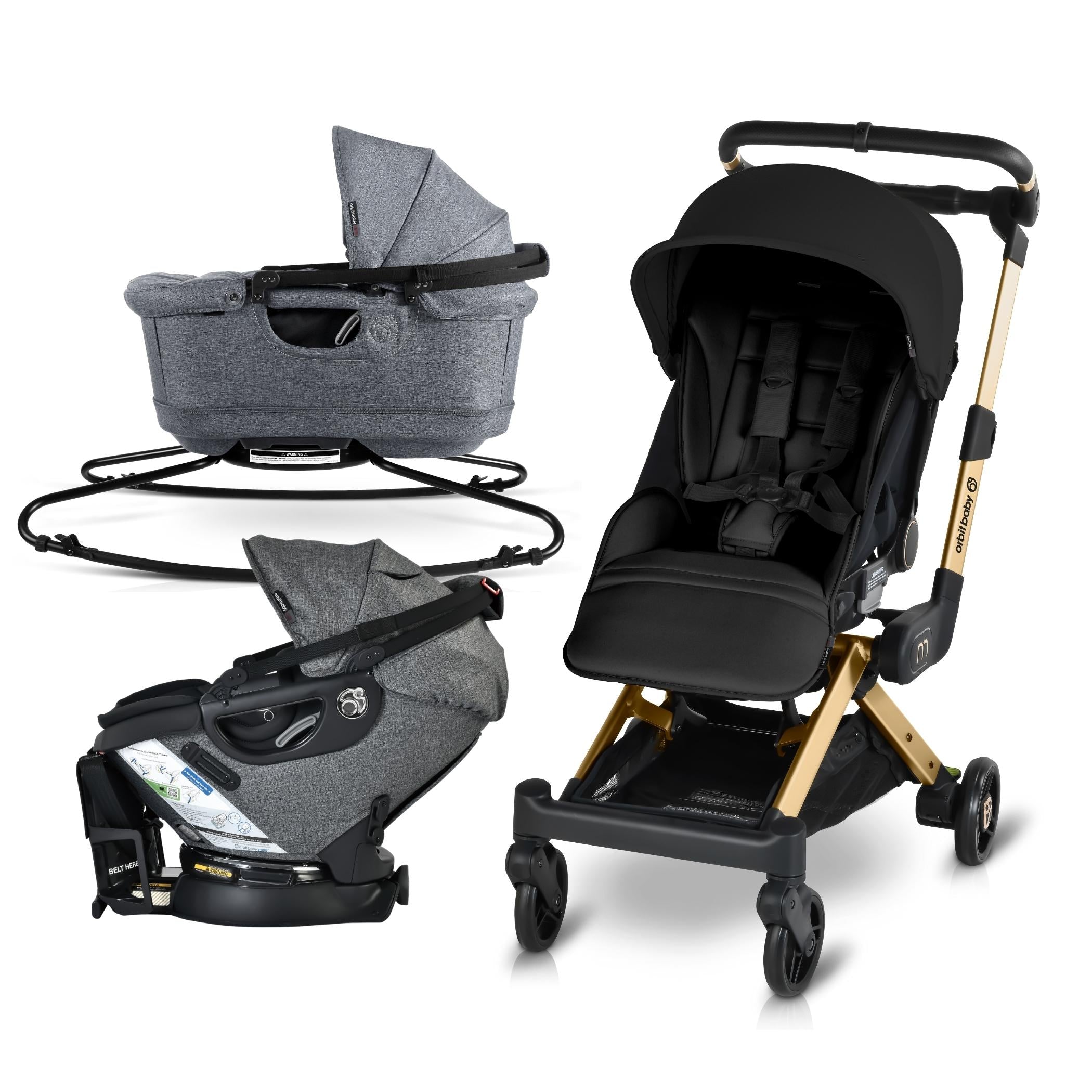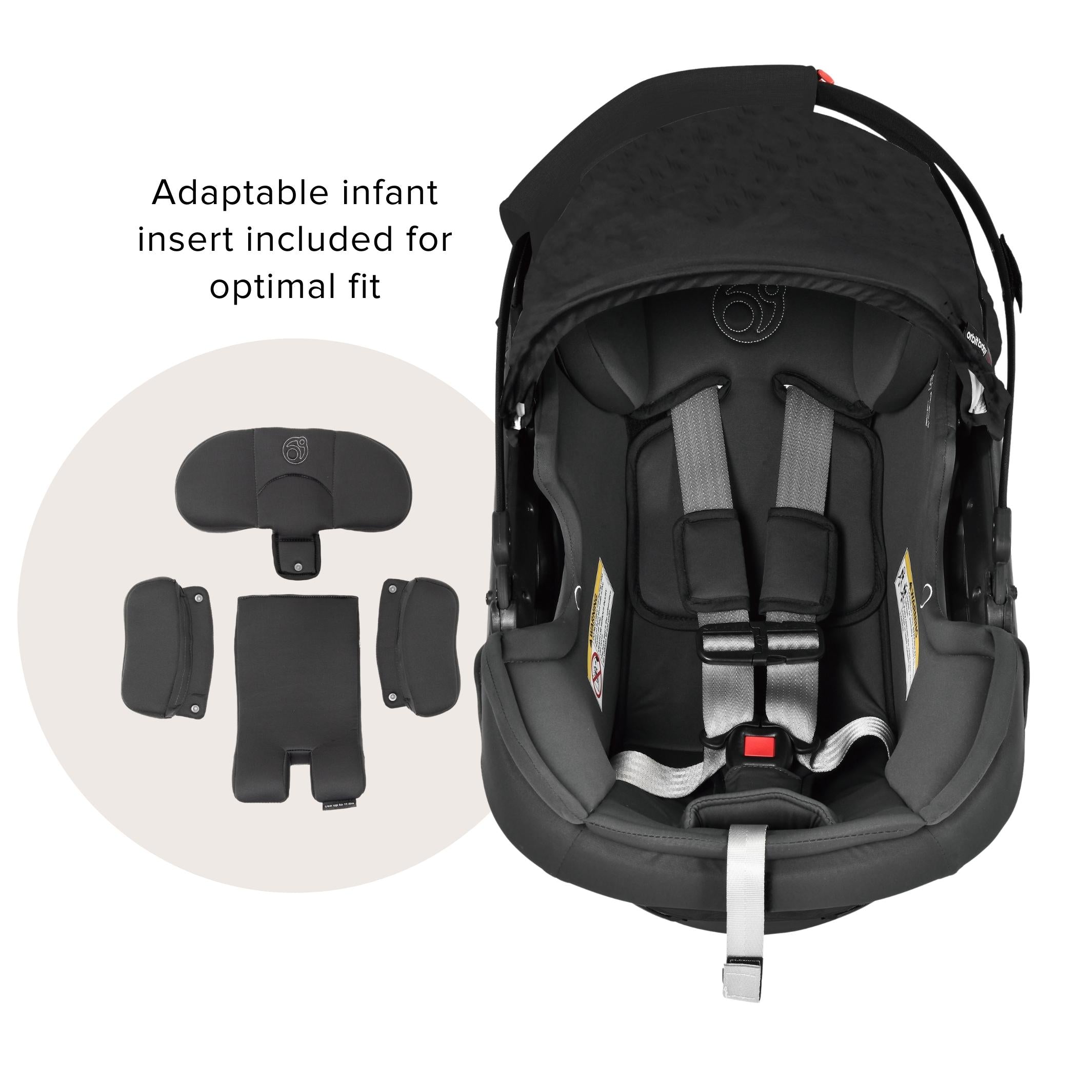The M+ Stroller is compatible with the Orbit Baby Infant Car Seat, Bassinet and G5 Stroller Seat.